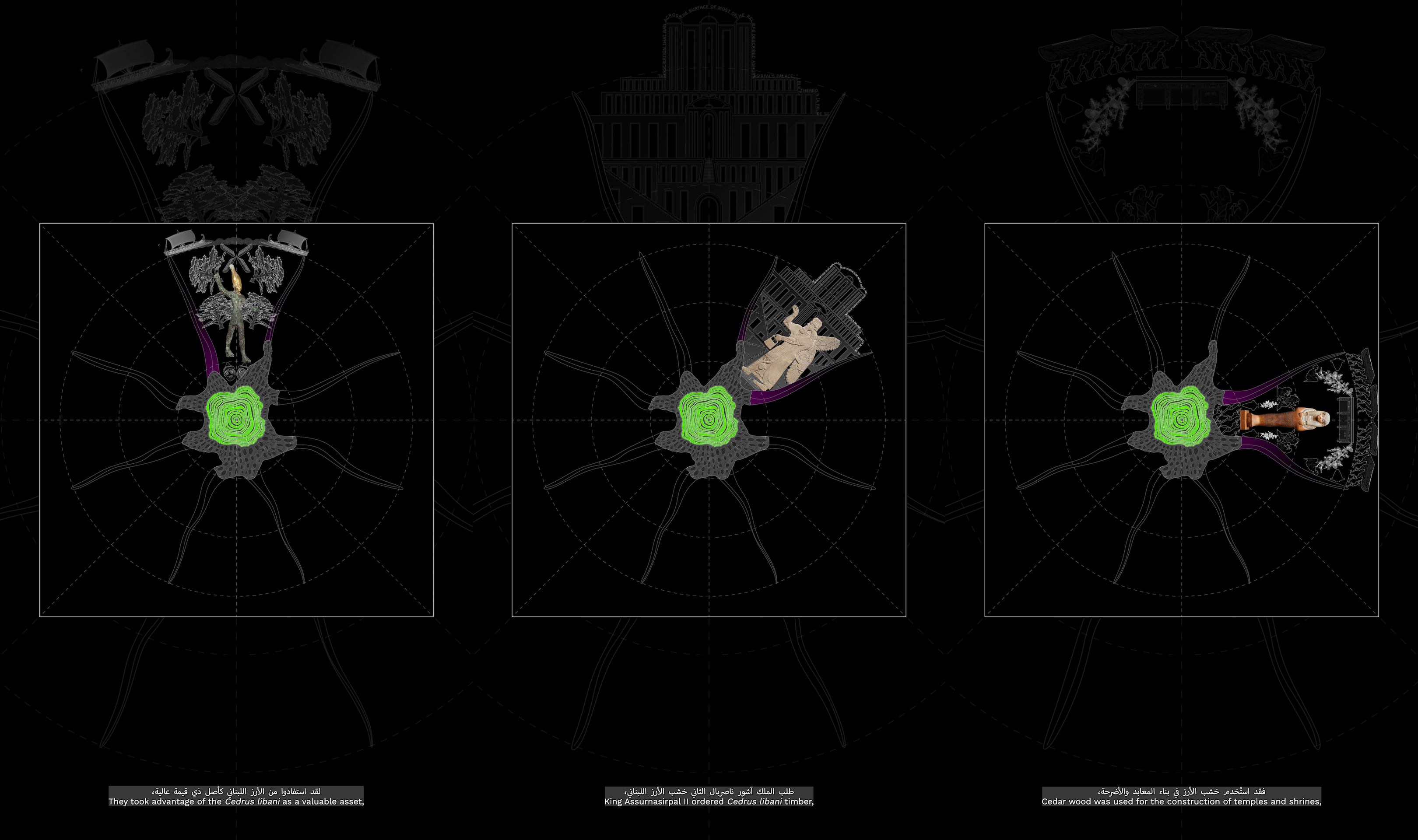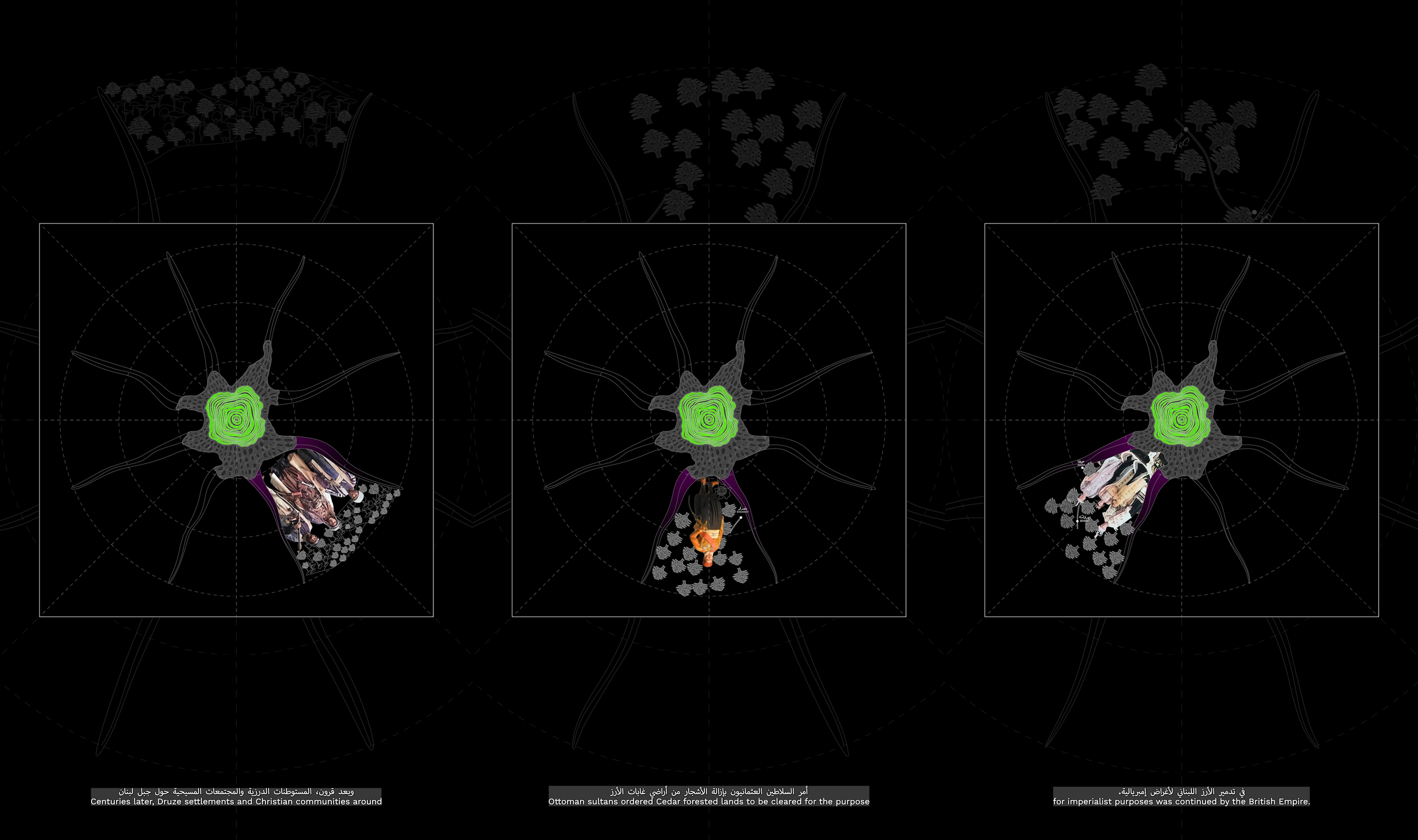 Exploited addresses the extraction and consumption of the Lebanese Cedar (Cedrus libani) by various civilizations throughout history. The deforestation of Mount Lebanon’s Cedar forests dates back to the ancient Canaanites, who felled and sold the Cedars to neighboring populations. In Egypt and Mesopotamia, Lebanese Cedars were used for building palaces, temples, ships, furniture, and tombs, and their resin was used for medicinal and ceremonial purposes, including mummification. In the Lebanese highlands, deforestation continued under early settlements of Druze and Maronites, who cleared forests to make way for homesteads and farms. Further deforestation of the tree took place at the hands of the Ottoman and British Empires, who used Lebanese Cedar timber for the construction of railroads and other infrastructure. Today, the protection of the most visited Cedrus libani forests—Shouf Biosphere and Cedars of God—effectively functions as a form of “greenwashing” for the factional leaders who proclaimed themselves the stewards of the land in the aftermath of the Lebanese Civil War.